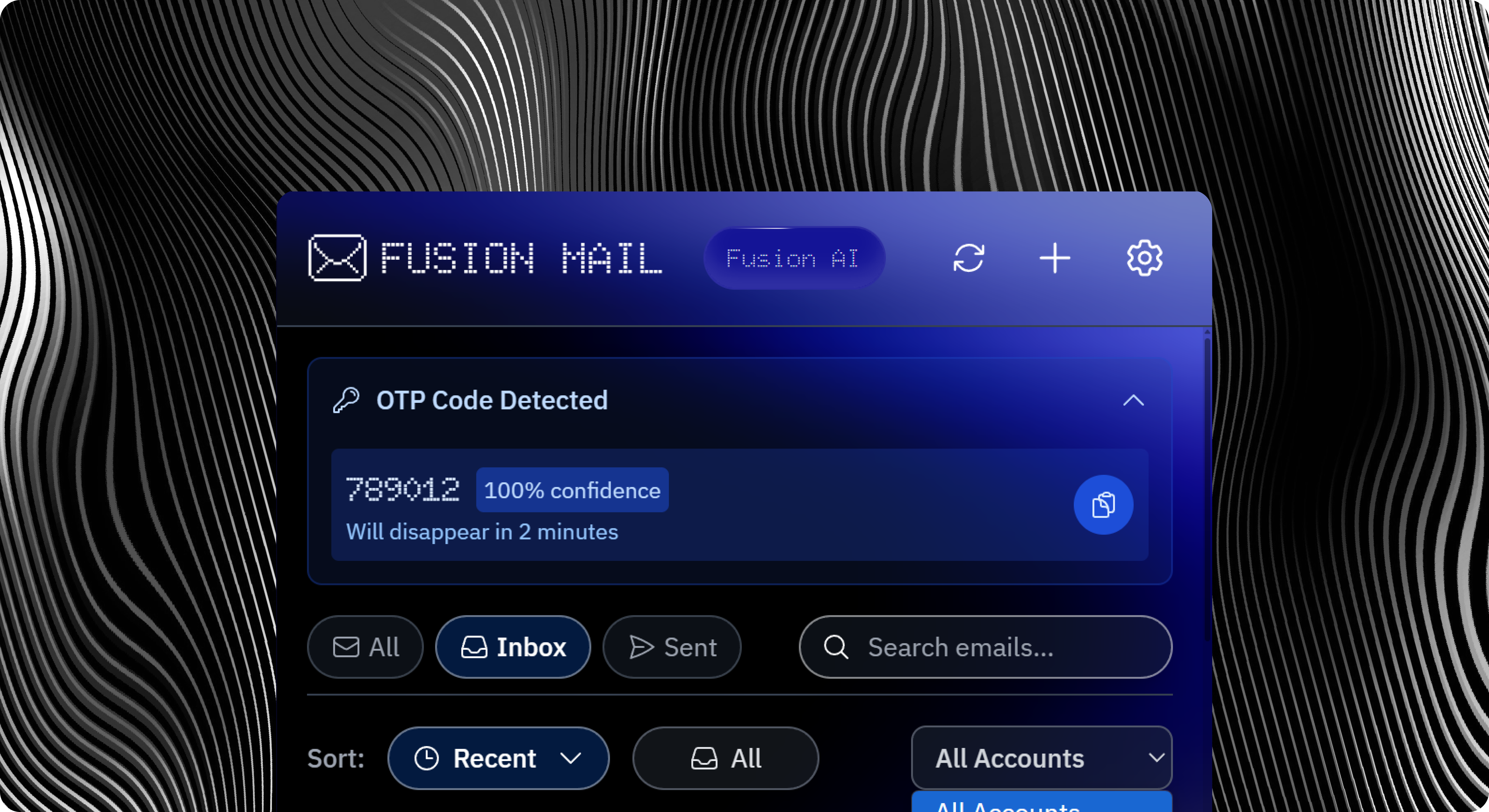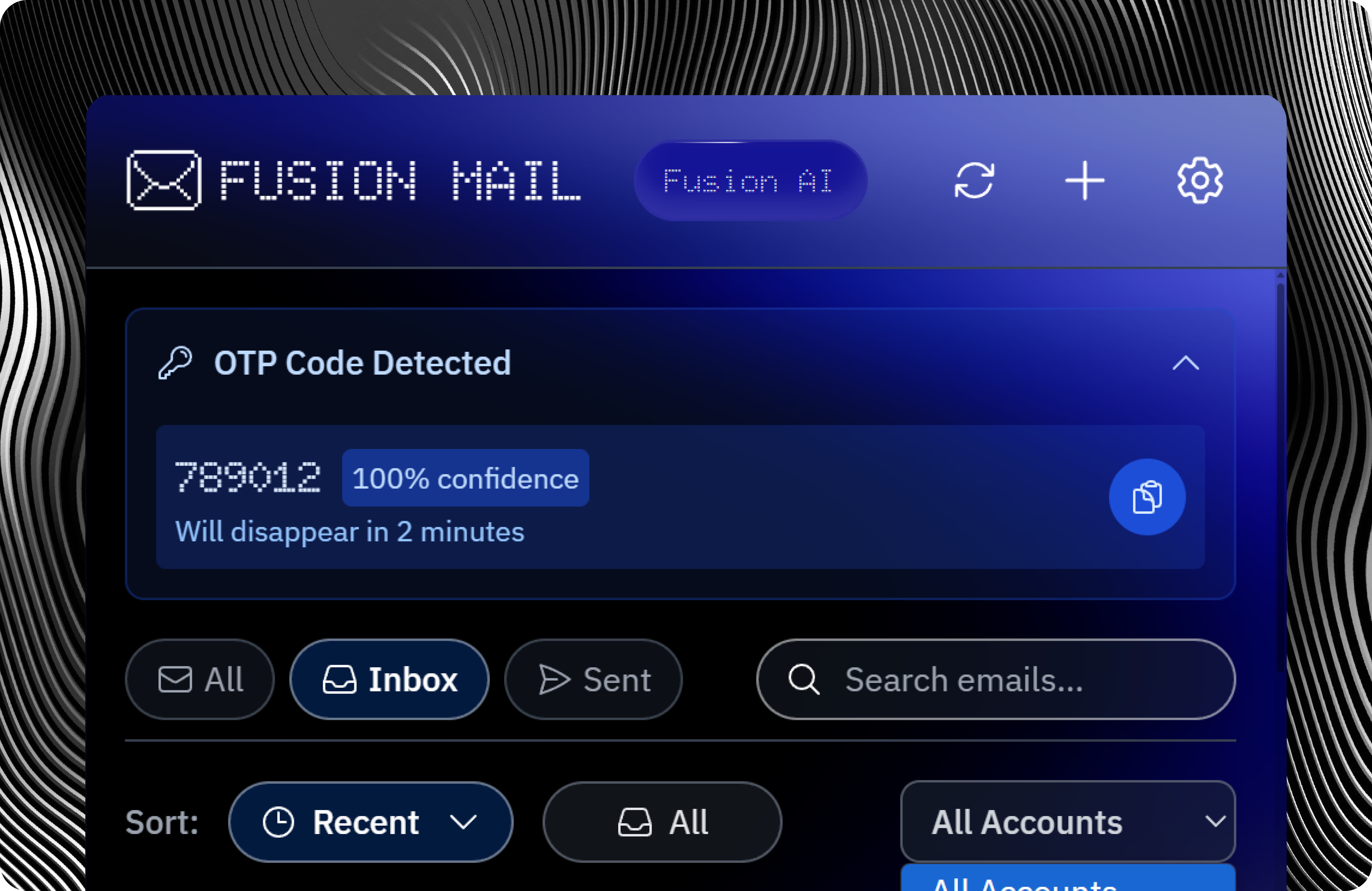 Fusion Mail automatically scans incoming emails for one-time passwords (OTPs) and verification codes. When detected, it can automatically copy the code to your clipboard or even auto-fill it in the appropriate field, saving you time and reducing the chance of errors when entering verification codes.